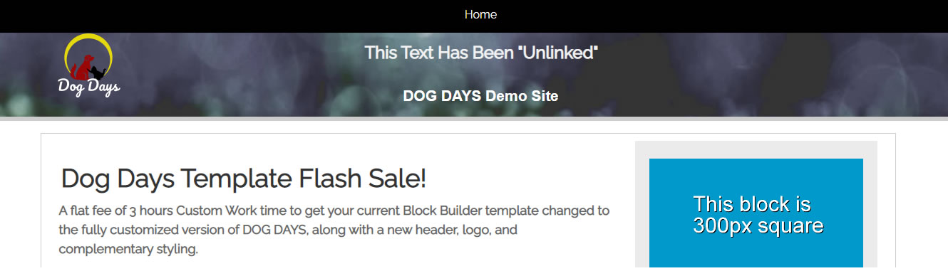 A flat fee of 3 hours Custom Work time to get your current Block Builder template changed to the fully customized version of DOG DAYS, along with a new header, logo, and complementary styling.